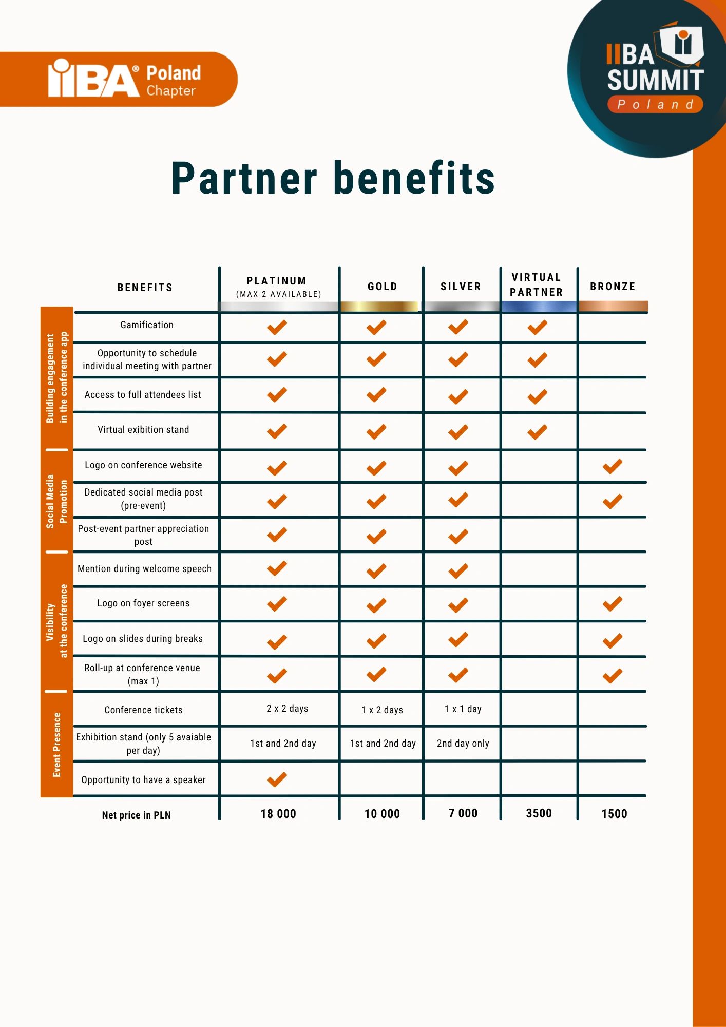 Join us as a partner of the IIBA Poland Summit 2026 – the largest conference dedicated to business analysis in Central and Eastern Europe, bringing together a vibrant community of professionals, leaders, and innovators.